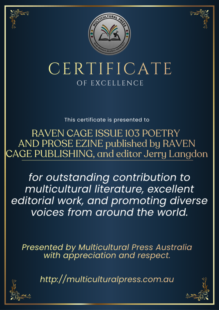 RAVEN CAGE ISSUE 103 POETRY AND PROSE EZINE, published by RAVEN CAGE PUBLISHING and edited by JERRY LANGDON, stands out because it brings together writers from many different countries and backgrounds, and this makes it feel rich and full of life. When you read it, you can clearly see that each writer comes with their own culture, feelings, and way of seeing the world. This makes the reading experience more interesting because you are not hearing just one type of voice again and again. Instead, every few pages feel new and fresh. The editorial team has done amazing work here, because it is not easy to collect writing from across the world and shape it into one strong publication. They have clearly spent a lot of time finding these voices and making sure they fit together. Because of their effort, the ezine feels like a global conversation where many people are sharing their thoughts, emotions, and stories in one place.